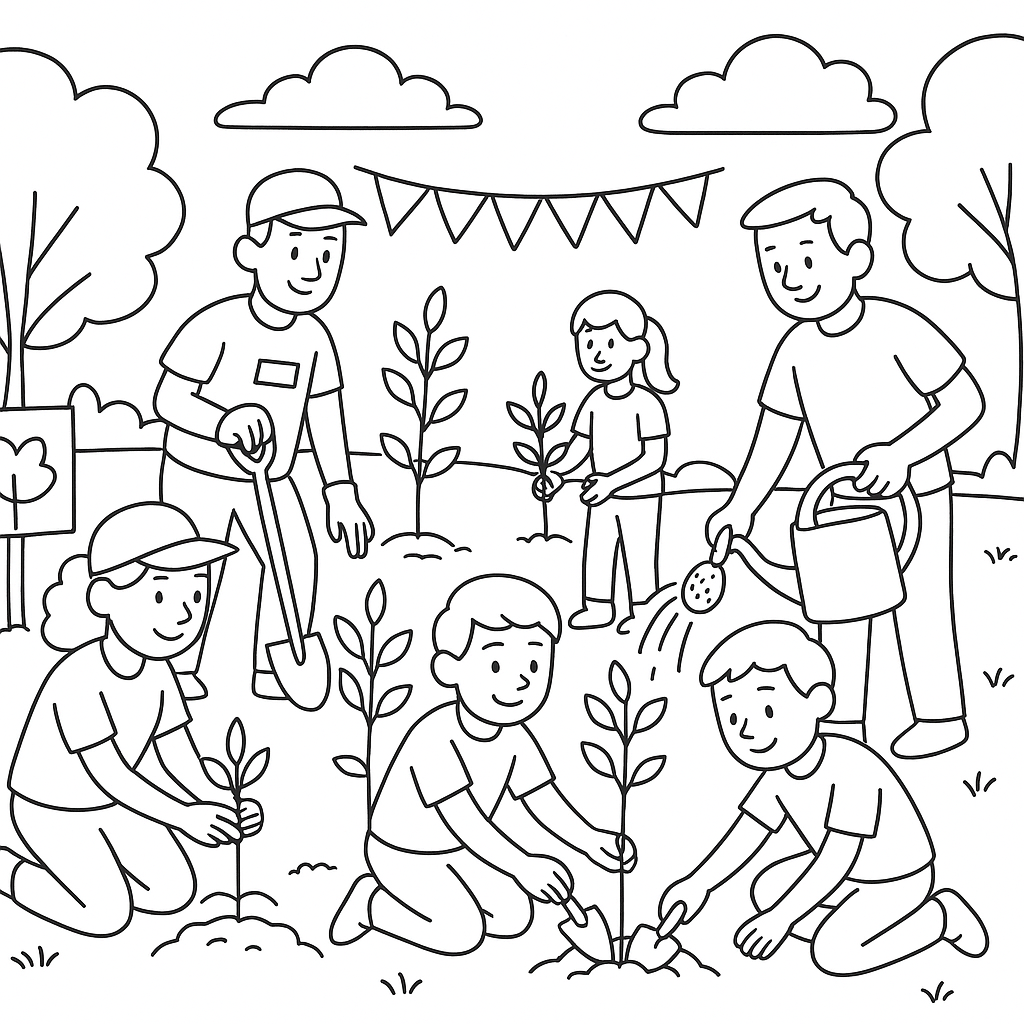 A medium coloring page featuring volunteers planting trees in a community park ceremony. Perfect for kids (6-9) with moderately detailed outlines for a fun coloring experience.