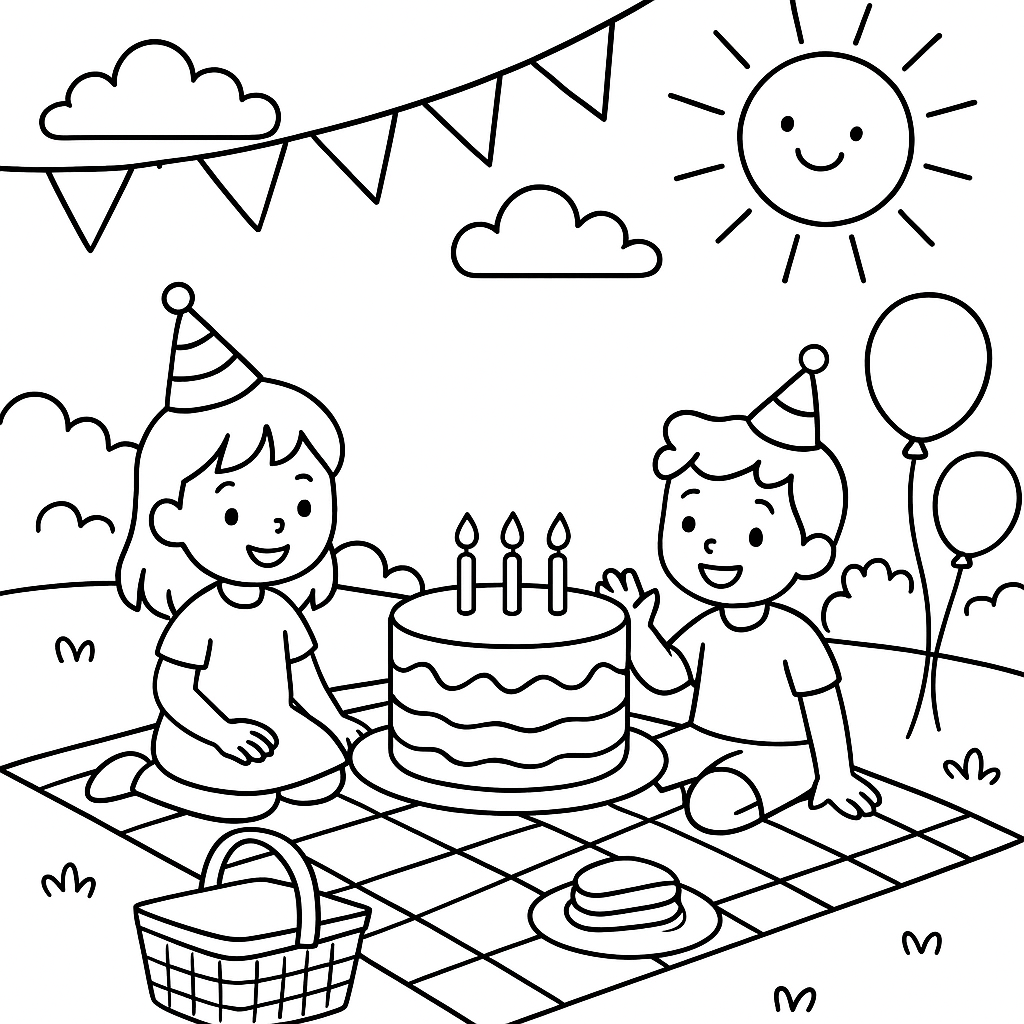 A simple coloring page featuring outdoor birthday party with picnic and cake. Perfect for kids (4-6) with large, bold outlines for a fun coloring experience.
