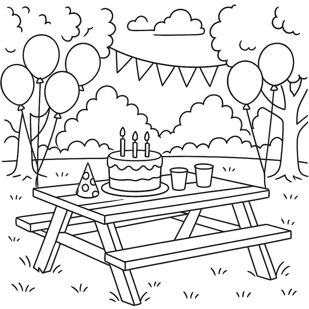 A medium coloring page featuring outdoor birthday party with picnic table and balloons. Perfect for kids (6-9) with moderately detailed outlines for a fun coloring experience.