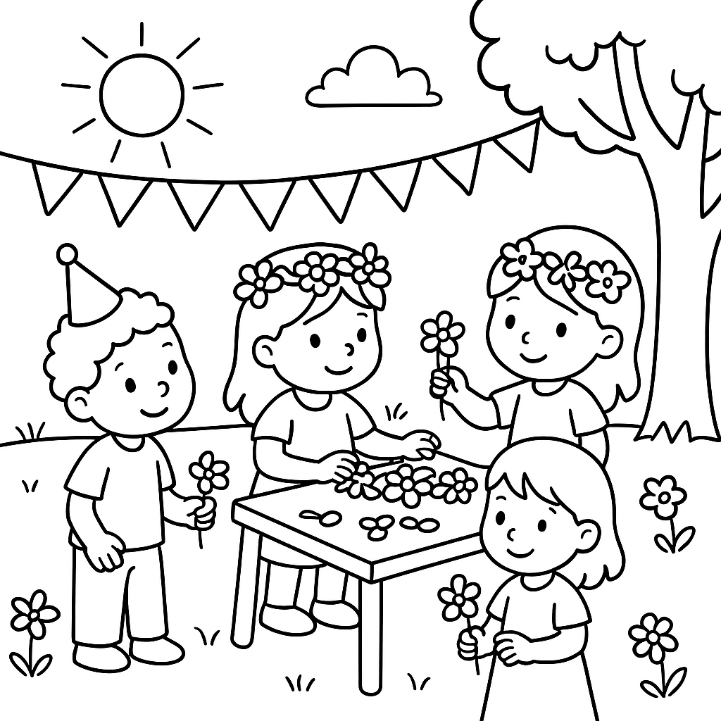 A simple coloring page featuring outdoor spring birthday party with flower crown making activity. Perfect for kids (4-6) with large, bold outlines for a fun coloring experience.