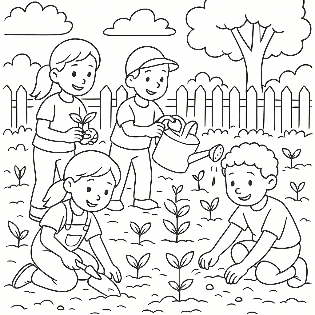 A medium coloring page featuring children planting seedlings in community garden. Perfect for kids (6-9) with moderately detailed outlines for a fun coloring experience.
