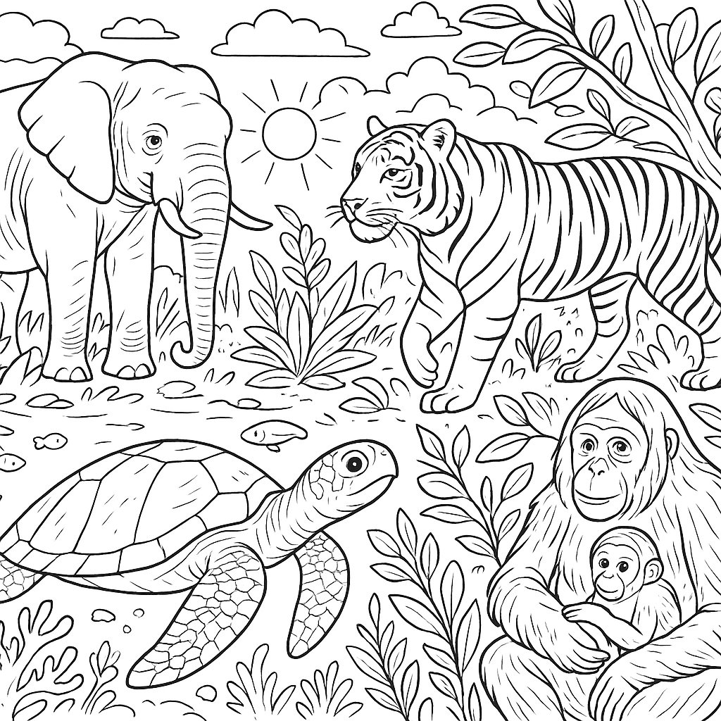 A detailed coloring page featuring endangered animals in their natural habitats. Perfect for tweens (9-12) with intricate detail for a fun coloring experience.