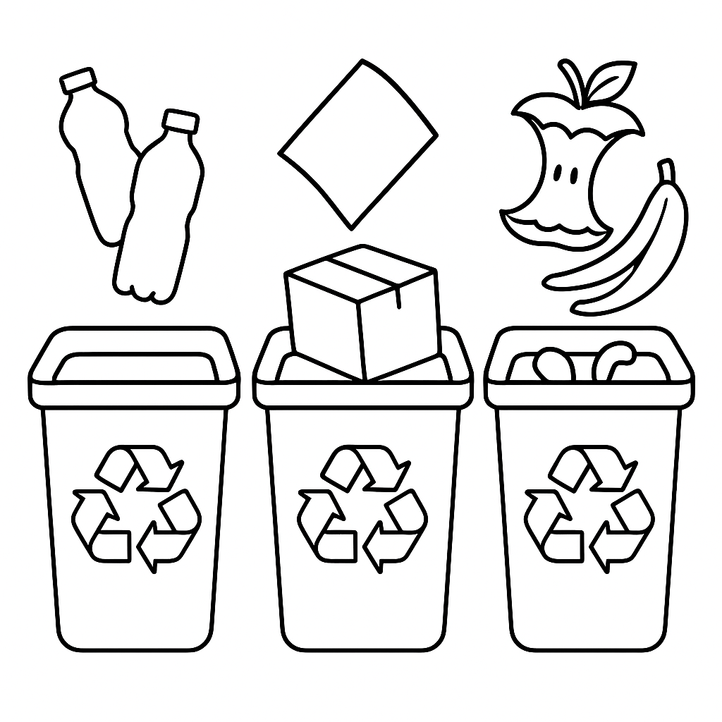 A simple coloring page featuring recycling bins with different materials being sorted. Perfect for kids (4-6) with large, bold outlines for a fun coloring experience.