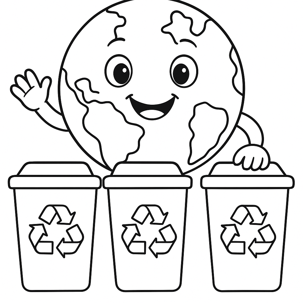 A simple coloring page featuring recycling bins with happy earth character. Perfect for kids (4-6) with large, bold outlines for a fun coloring experience.