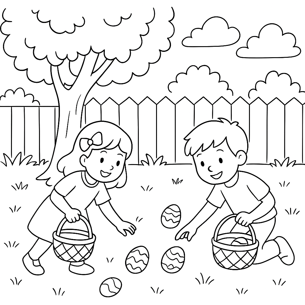 A medium coloring page featuring an Easter egg hunt scene in a backyard. Perfect for kids (6-9) with moderately detailed outlines for a fun coloring experience.