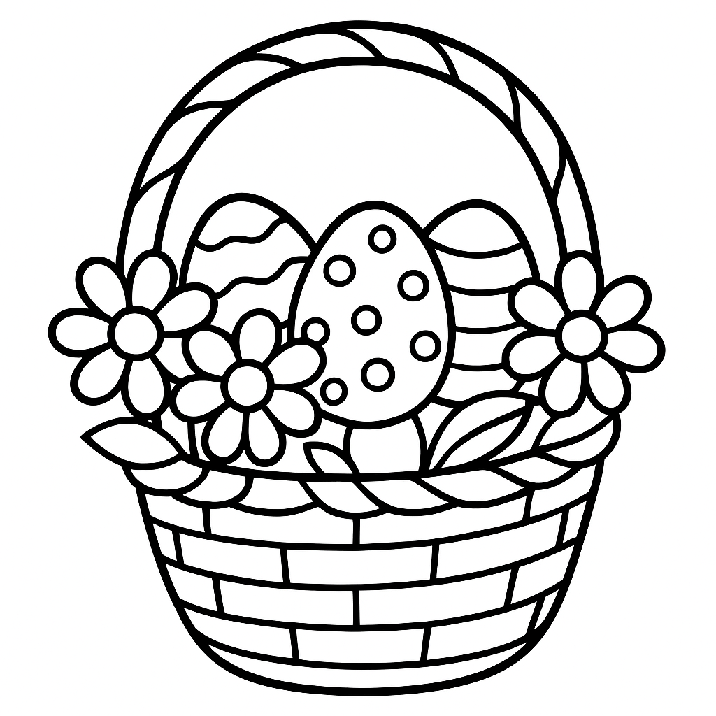 A simple coloring page featuring easter basket filled with colorful eggs and flowers. Perfect for kids (4-6) with large, bold outlines for a fun coloring experience.