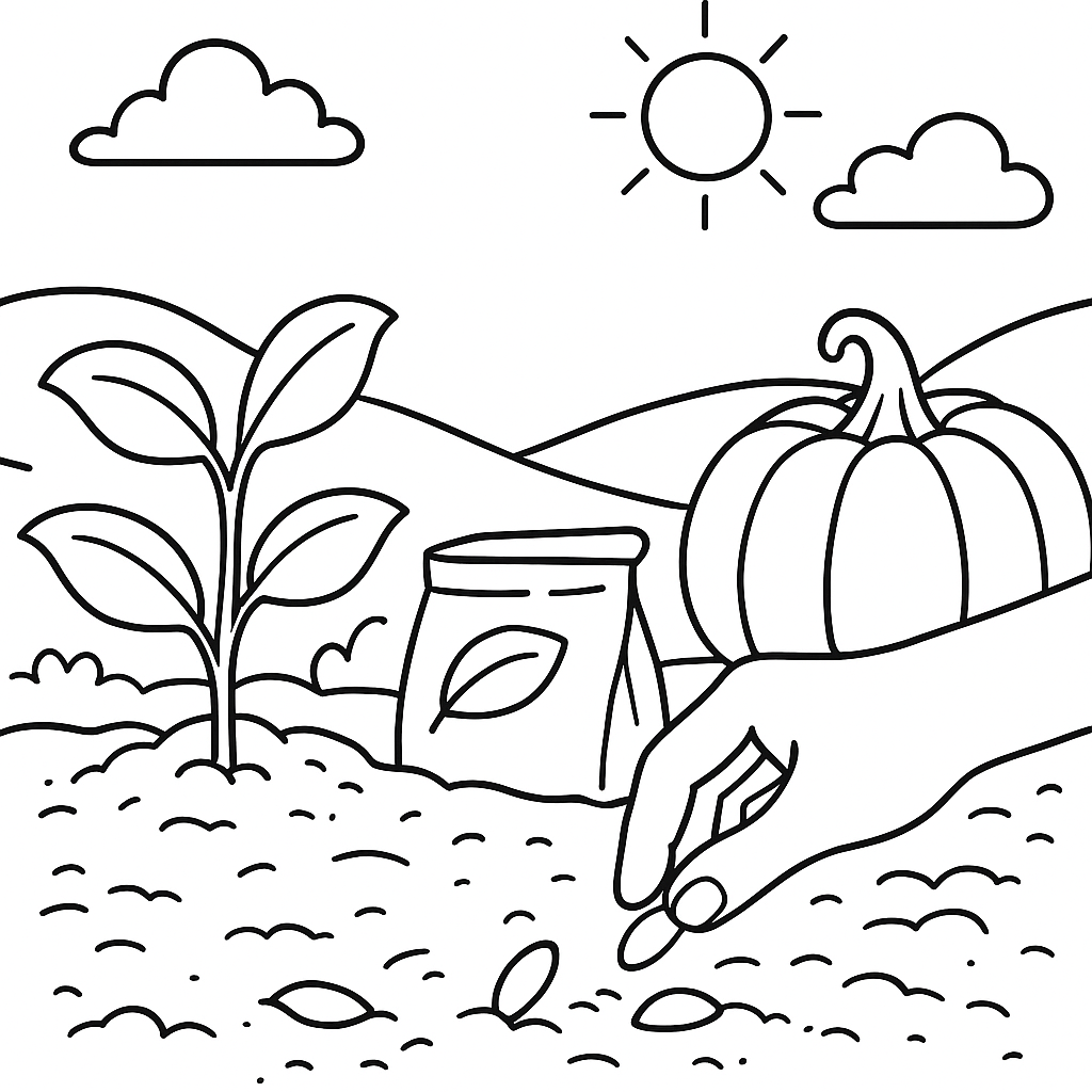 A medium coloring page featuring pumpkin seeds being planted in spring garden for fall harvest. Perfect for kids (6-9) with moderately detailed outlines for a fun coloring experience.