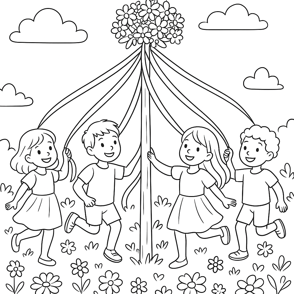A medium coloring page featuring children dancing around may pole with flowers. Perfect for kids (6-9) with moderately detailed outlines for a fun coloring experience.