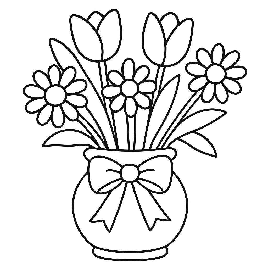 A simple coloring page featuring a bouquet of tulips and daisies in a vase with a ribbon. Perfect for toddlers (2-4) with large, bold outlines for a fun coloring experience.