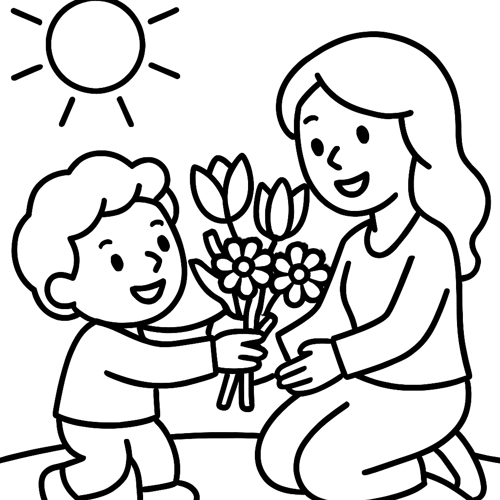 A simple coloring page featuring a child giving a bouquet of tulips and daisies to mom on a bright sunny morning. Perfect for kids (4-6) with large, bold outlines for a fun coloring experience.