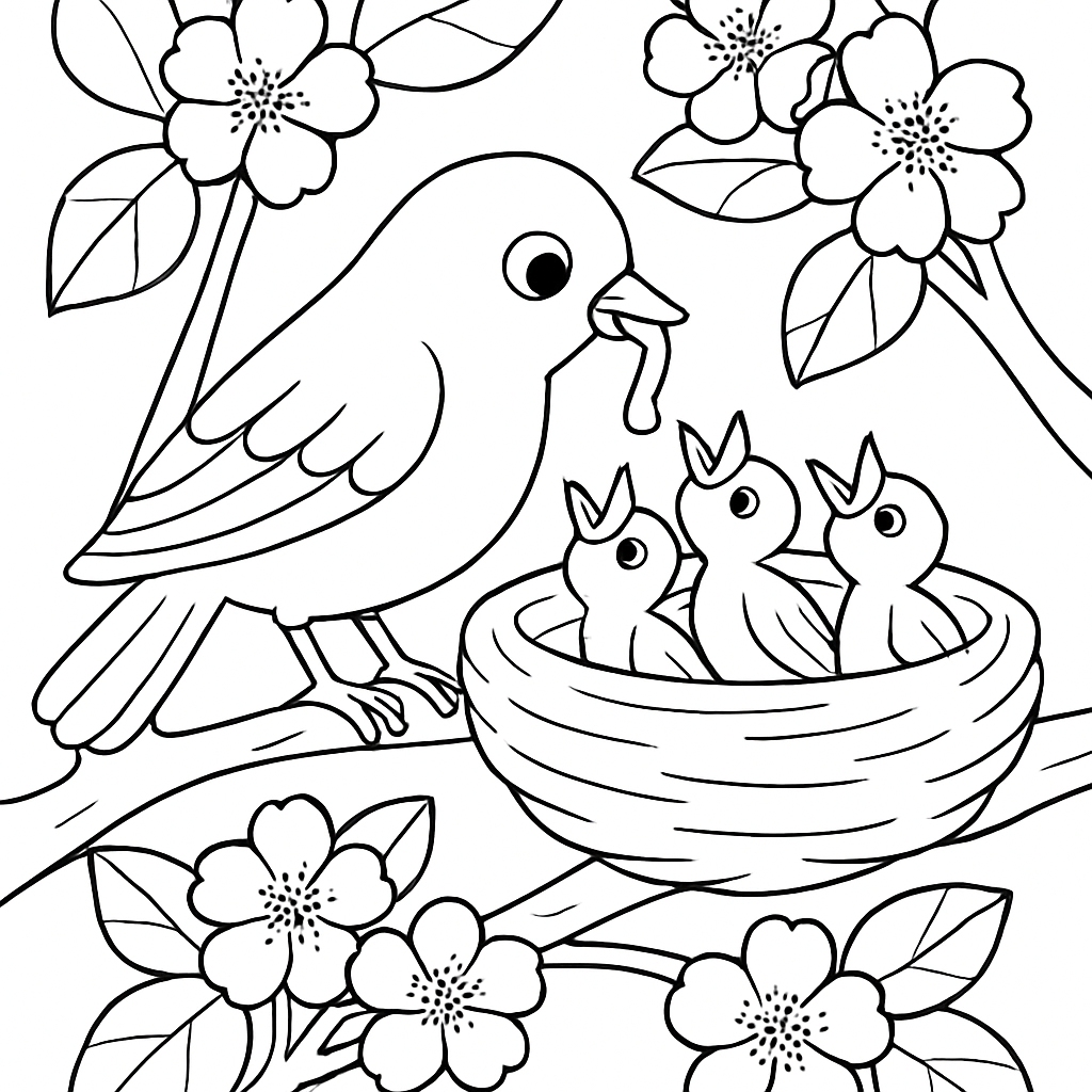 A medium coloring page featuring a mother bird feeding her babies in a cozy nest tucked into a flowering apple tree branch. Perfect for kids (6-9) with moderately detailed outlines for a fun coloring experience.