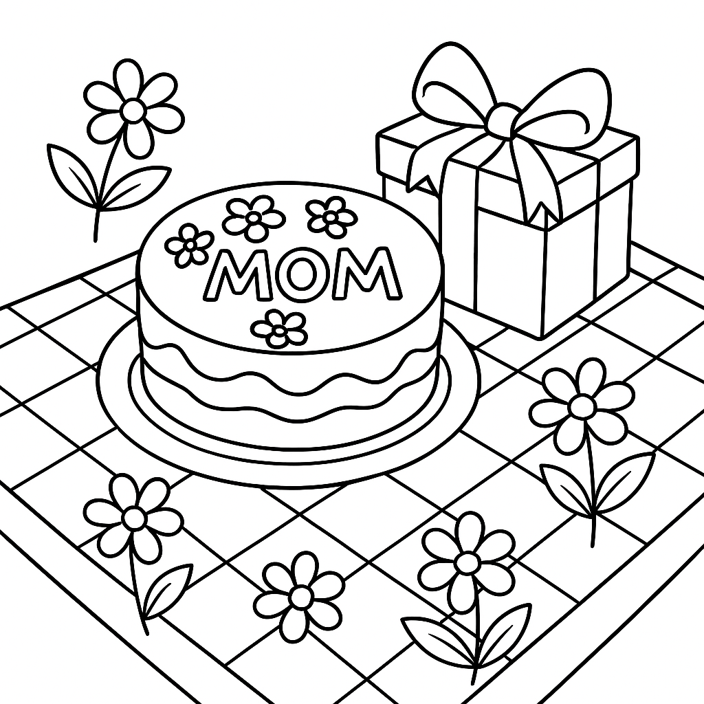 A medium coloring page featuring a picnic blanket with flowers, a cake, and a gift box for mom. Perfect for kids (6-9) with moderately detailed outlines for a fun coloring experience.