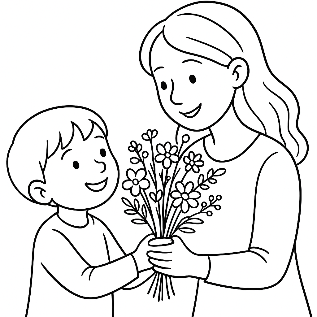 A medium coloring page featuring child giving mother a bouquet of spring wildflowers. Perfect for kids (6-9) with moderately detailed outlines for a fun coloring experience.