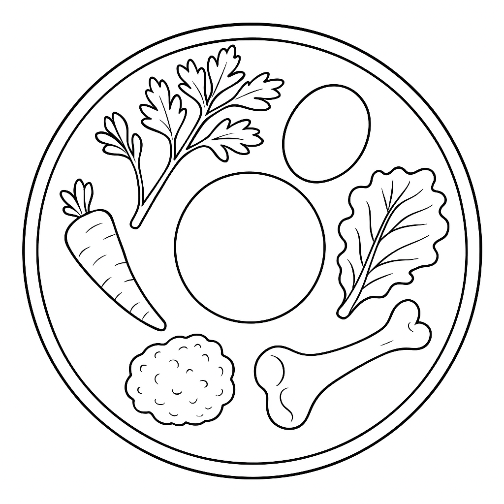 A medium coloring page featuring seder plate with spring herbs and symbolic foods arranged carefully. Perfect for kids (6-9) with moderately detailed outlines for a fun coloring experience.