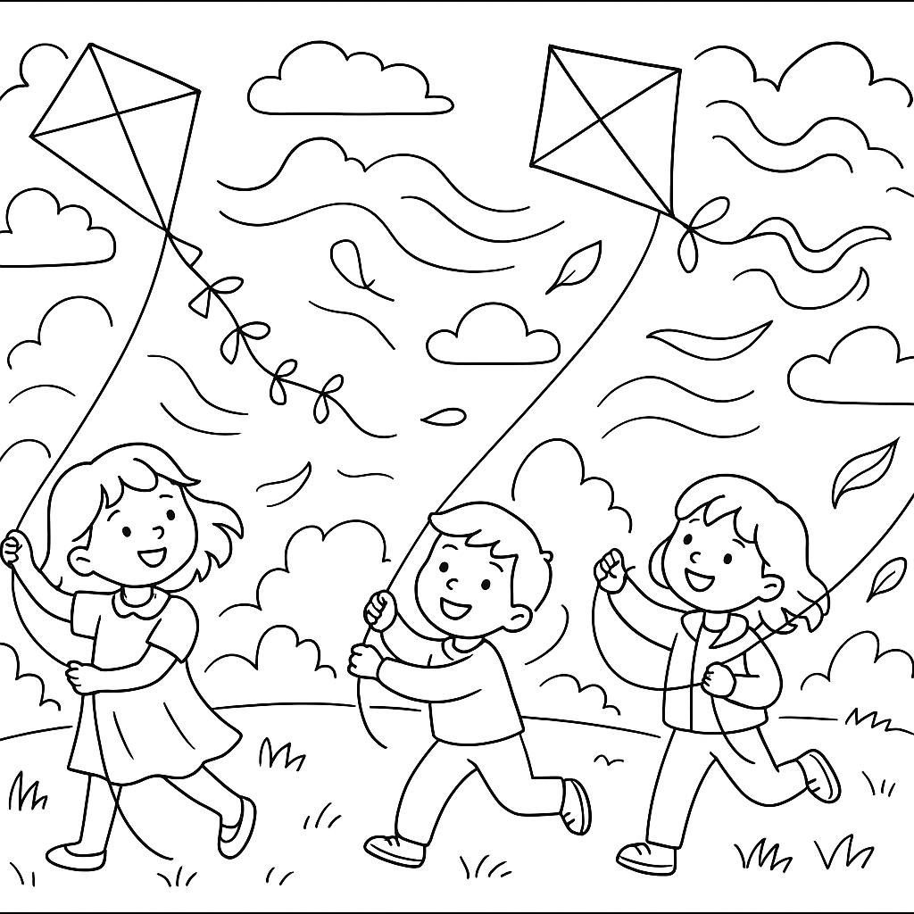 A medium coloring page featuring children flying colorful kites on a windy April day. Perfect for kids (6-9) with moderately detailed outlines for a fun coloring experience.