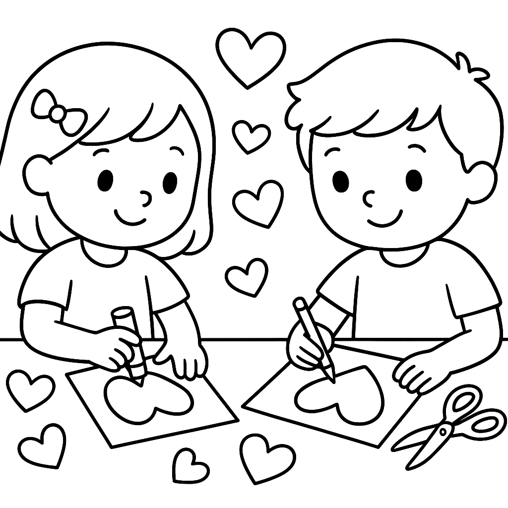 A simple coloring page featuring children making valentine cards with hearts. Perfect for kids (4-6) with large, bold outlines for a fun coloring experience.