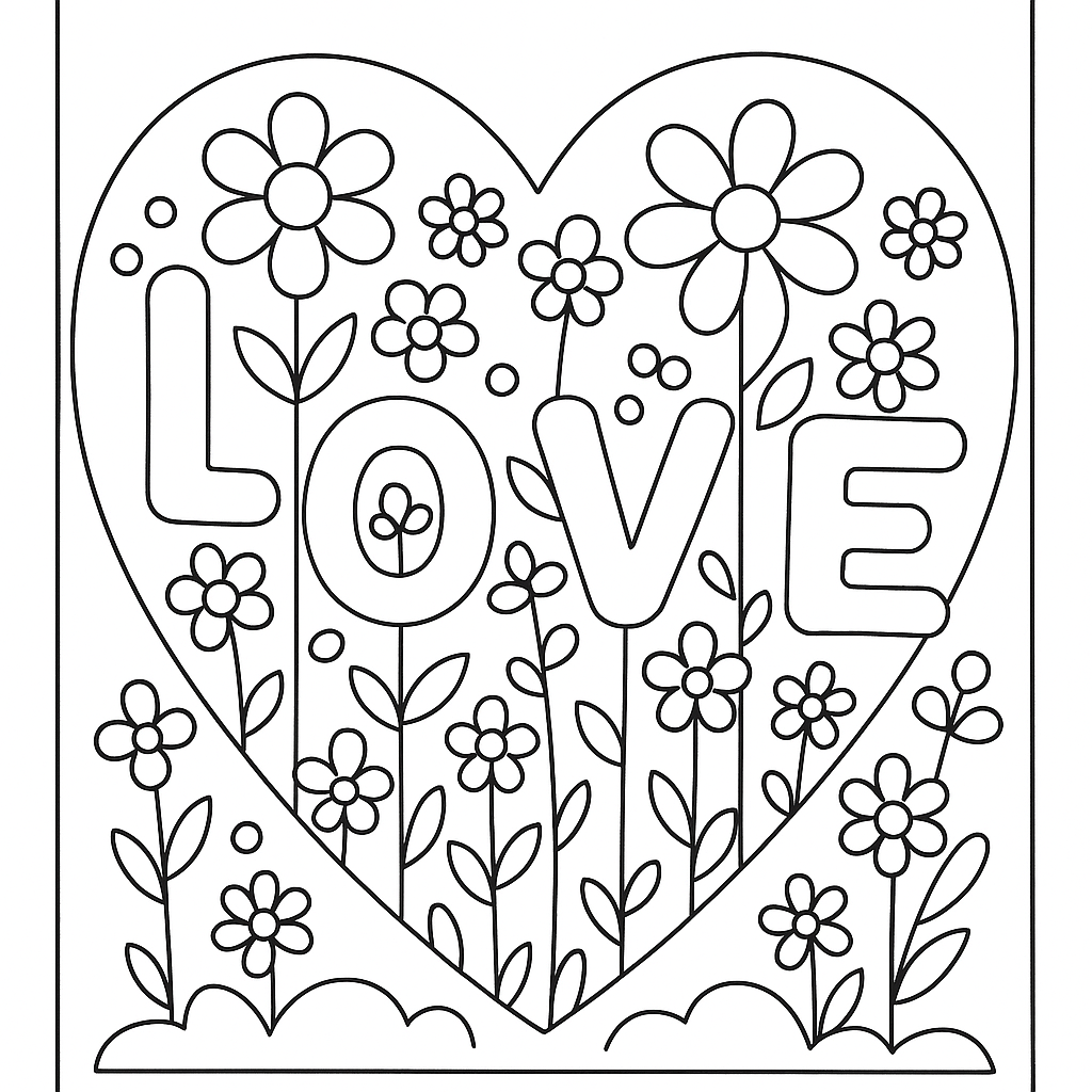 A simple coloring page featuring heart-shaped garden planted with flowers spelling LOVE. Perfect for kids (4-6) with large, bold outlines for a fun coloring experience.