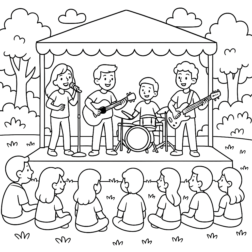A medium coloring page featuring outdoor concert in park with musicians and audience on grass. Perfect for kids (6-9) with moderately detailed outlines for a fun coloring experience.