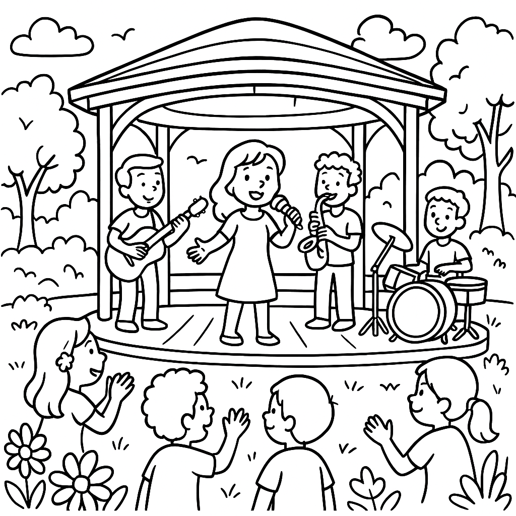 A medium coloring page featuring outdoor spring concert in park pavilion. Perfect for kids (6-9) with moderately detailed outlines for a fun coloring experience.