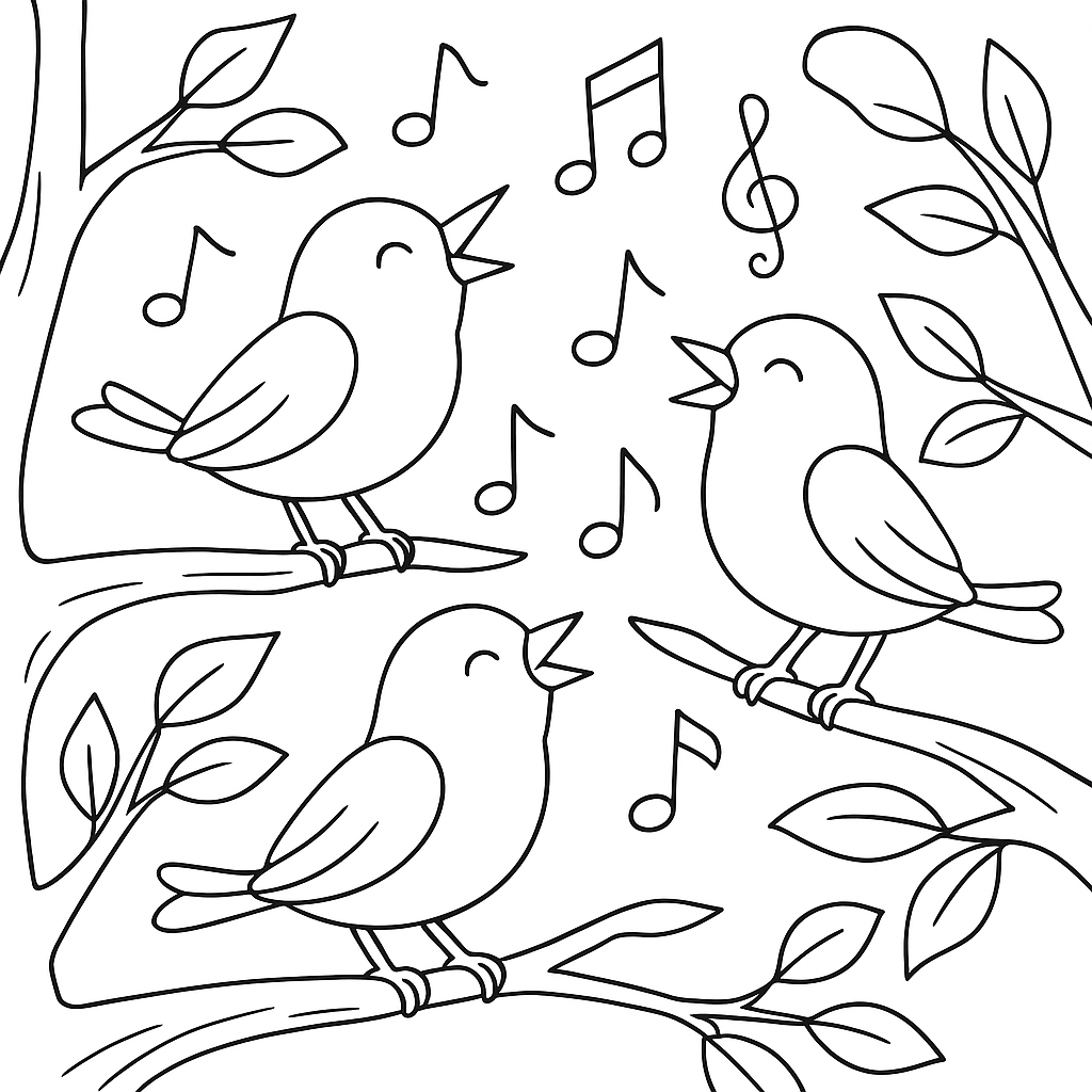 A medium coloring page featuring birds singing on tree branches with musical notes floating in air. Perfect for kids (6-9) with moderately detailed outlines for a fun coloring experience.