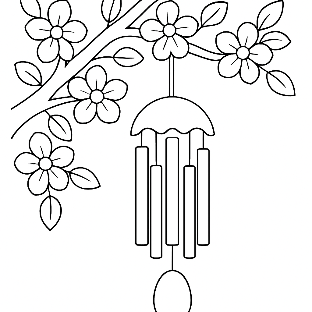 A medium coloring page featuring wind chimes hanging from a flowering tree branch. Perfect for kids (4-6) with moderately detailed outlines for a fun coloring experience.