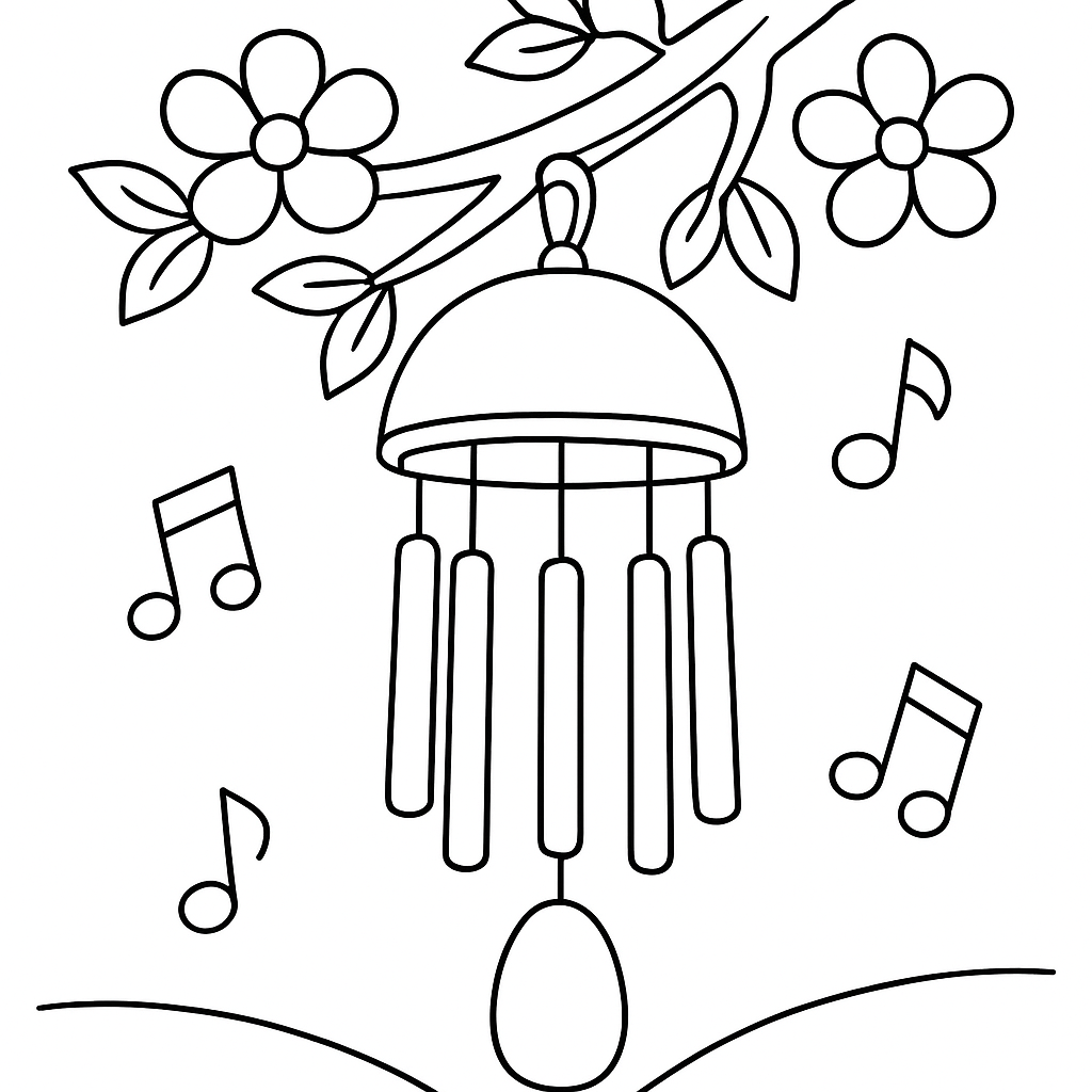 A simple coloring page featuring wind chimes hanging from a flowering branch making music. Perfect for kids (4-6) with large, bold outlines for a fun coloring experience.
