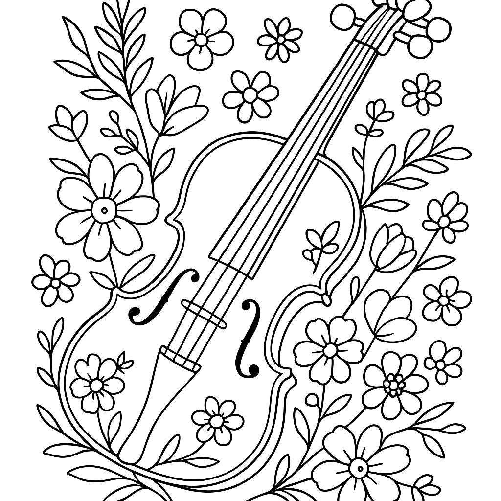 A medium coloring page featuring a violin decorated with painted spring flowers. Perfect for kids (6-9) with moderately detailed outlines for a fun coloring experience.