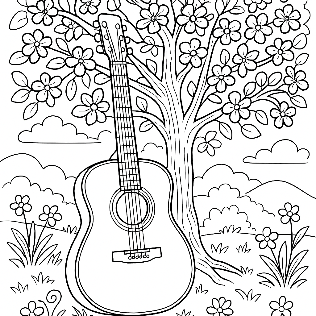 A detailed coloring page featuring acoustic guitar leaning against blooming tree outdoors. Perfect for tweens (9-12) with intricate detail for a fun coloring experience.