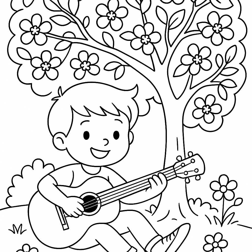 A medium coloring page featuring child playing guitar under blooming tree. Perfect for kids (6-9) with moderately detailed outlines for a fun coloring experience.