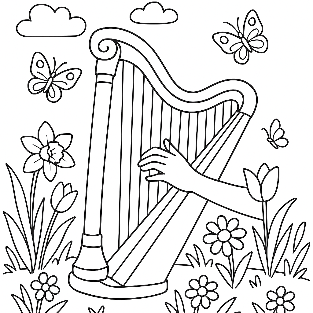 A medium coloring page featuring harp being played outdoors with spring flowers and butterflies. Perfect for kids (6-9) with moderately detailed outlines for a fun coloring experience.