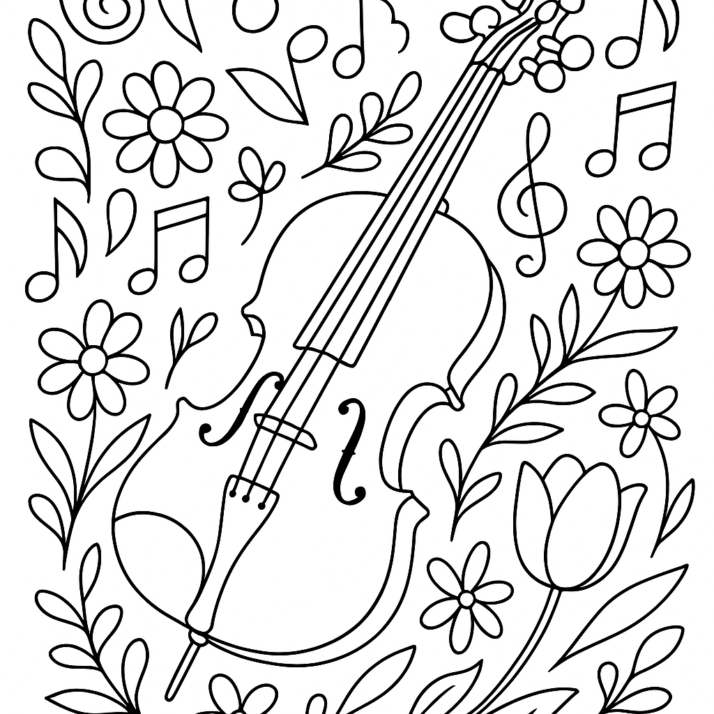 A medium coloring page featuring violin surrounded by musical notes and spring flowers. Perfect for kids (6-9) with moderately detailed outlines for a fun coloring experience.