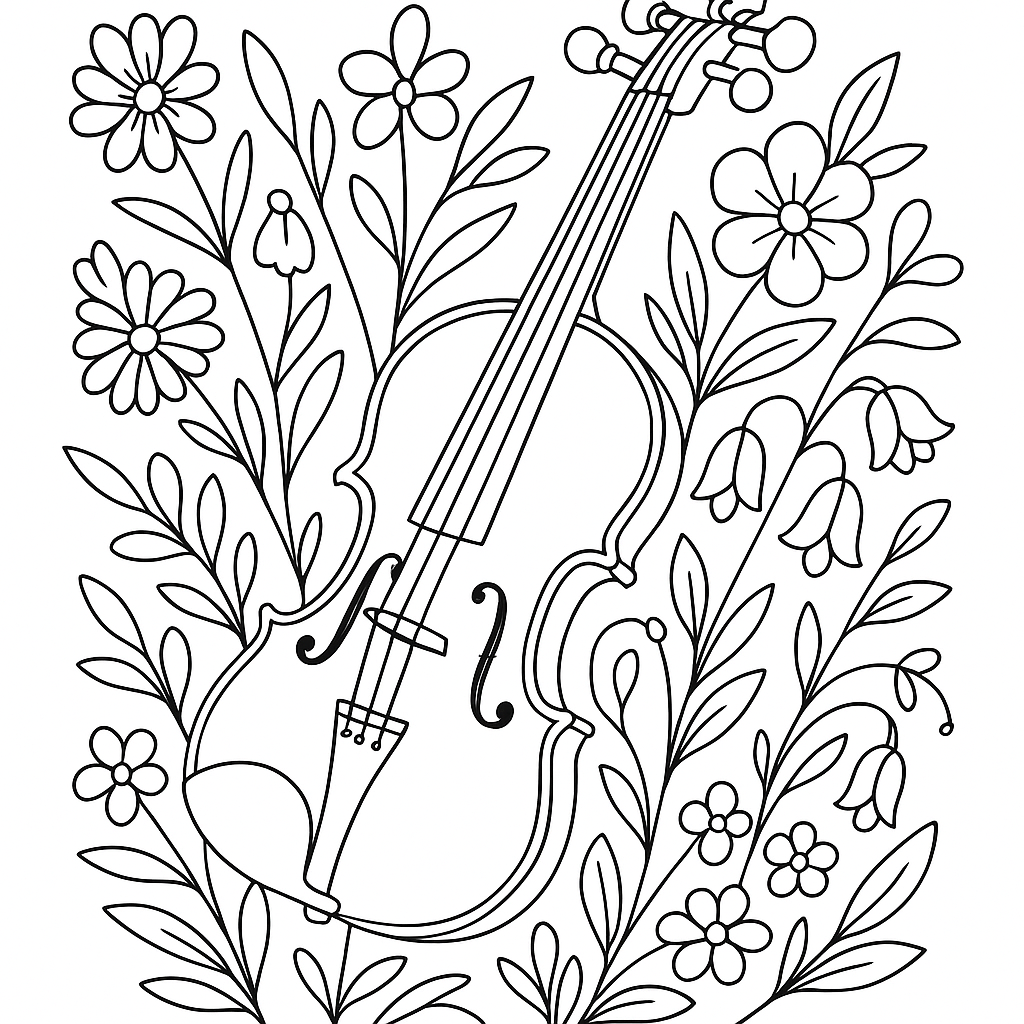 A detailed coloring page featuring violin with spring flowers growing from sound holes. Perfect for kids (6-9) with intricate detail for a fun coloring experience.