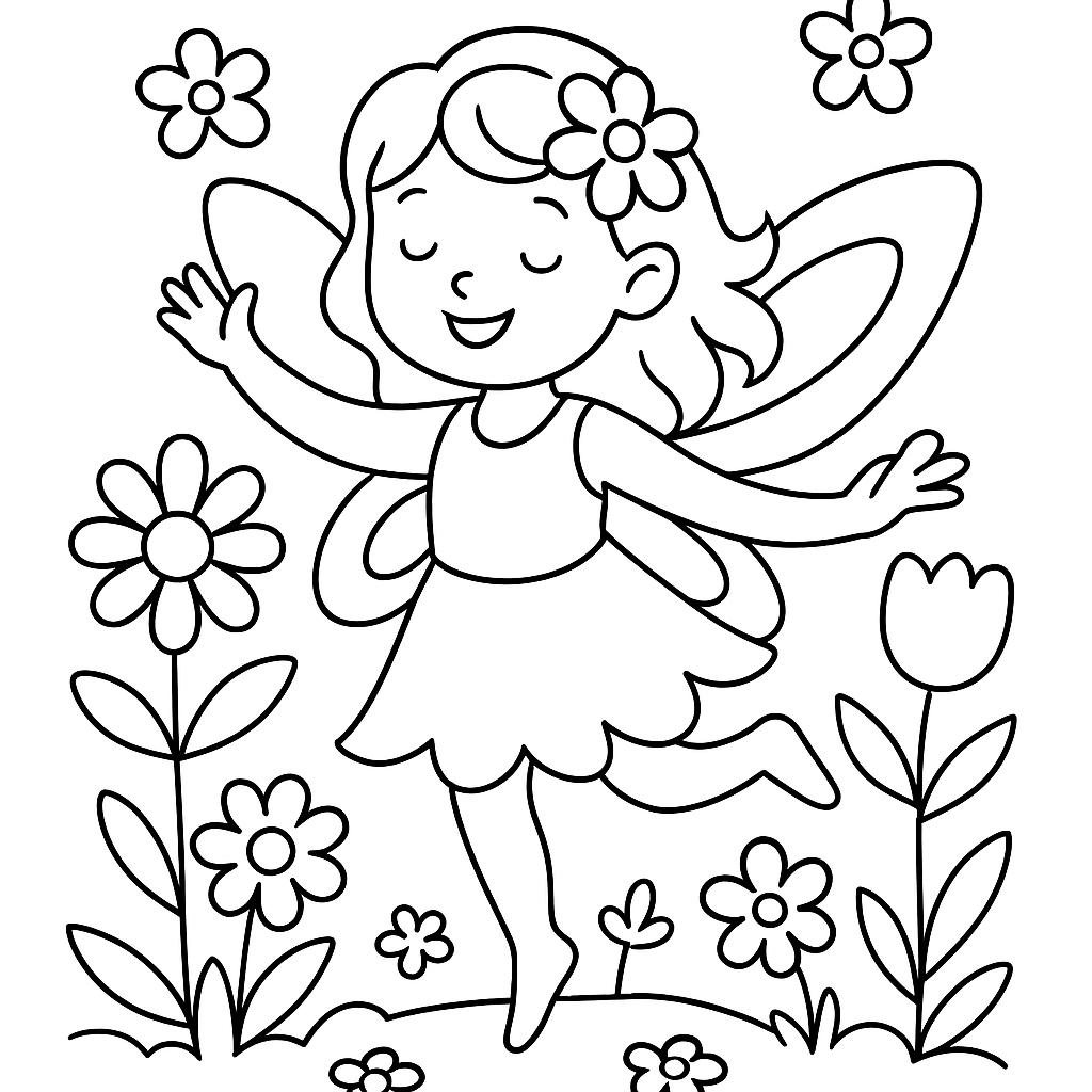 A simple coloring page featuring a spring fairy dancing among blooming flowers. Perfect for kids (4-6) with large, bold outlines for a fun coloring experience.