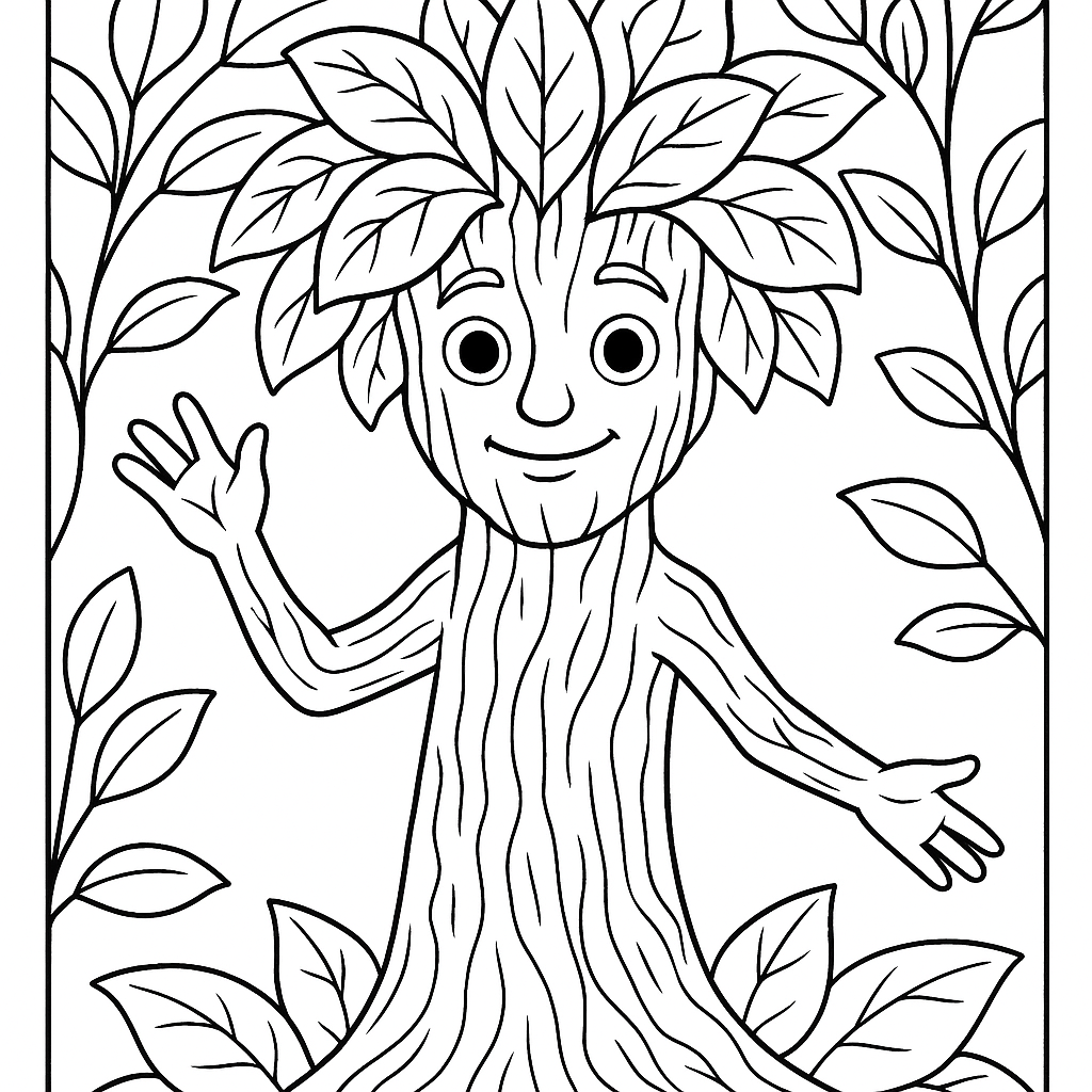 A medium coloring page featuring tree spirit with bark skin and leaf hair. Perfect for kids (6-9) with moderately detailed outlines for a fun coloring experience.
