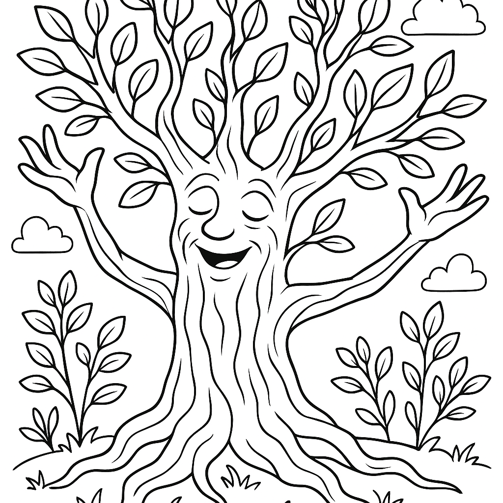 A medium coloring page featuring a tree spirit awakening with new spring leaves. Perfect for kids (6-9) with moderately detailed outlines for a fun coloring experience.