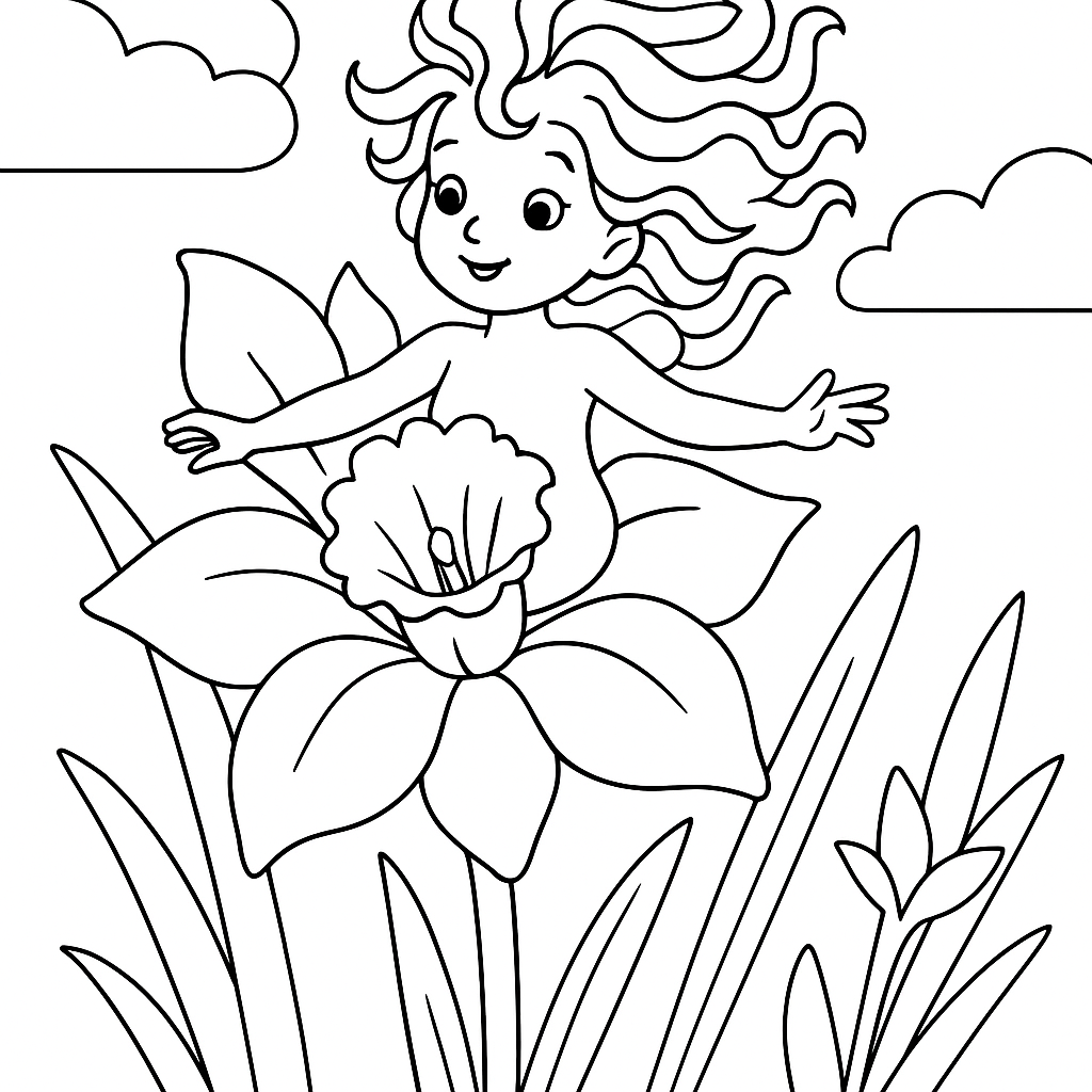 A medium coloring page featuring flower spirit emerging from a blooming daffodil. Perfect for kids (6-9) with moderately detailed outlines for a fun coloring experience.