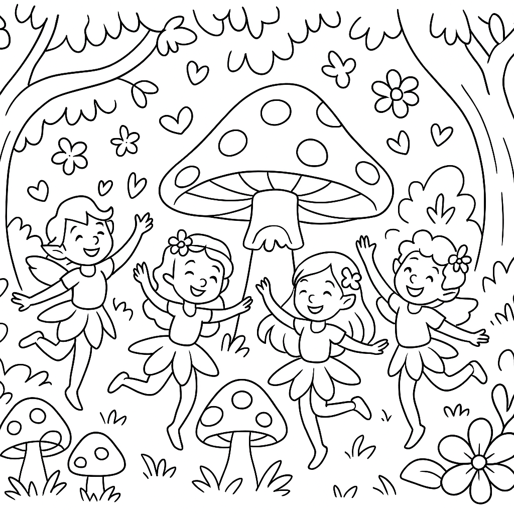 A medium coloring page featuring forest sprites dancing around mushrooms in a spring woodland. Perfect for kids (6-9) with moderately detailed outlines for a fun coloring experience.