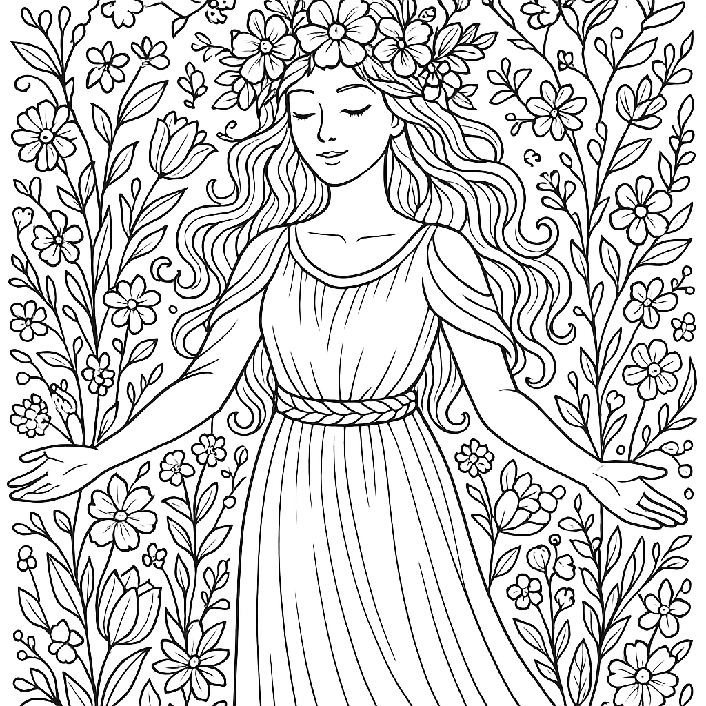 A detailed coloring page featuring spring awakening spirit surrounded by flowers. Perfect for tweens (9-12) with intricate detail for a fun coloring experience.