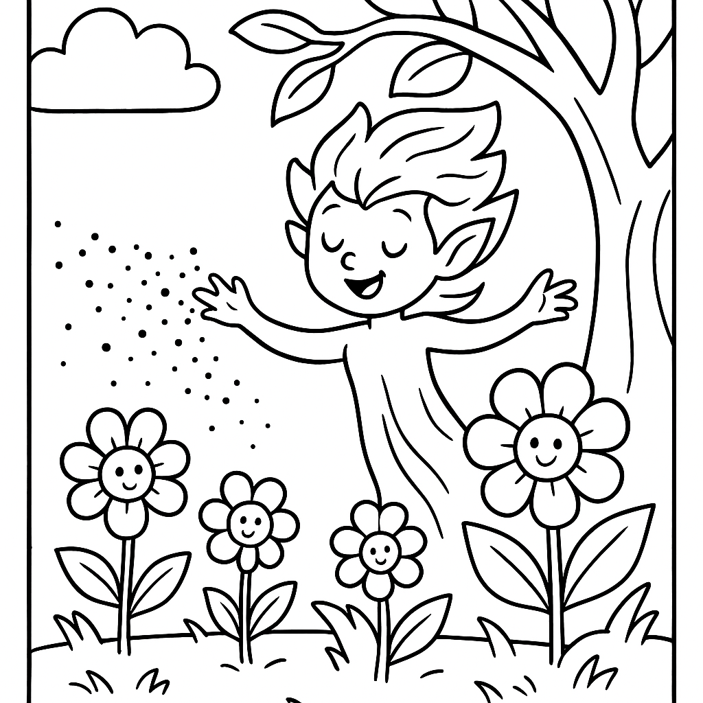 A medium coloring page featuring tree sprite awakening flowers with magical spring dust. Perfect for kids (4-6) with moderately detailed outlines for a fun coloring experience.