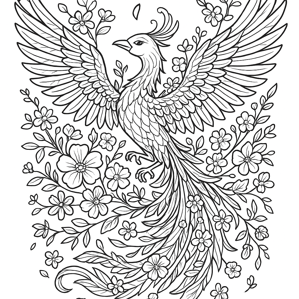 A detailed coloring page featuring a phoenix rising with spring flowers growing from its feathers. Perfect for tweens (9-12) with intricate detail for a fun coloring experience.