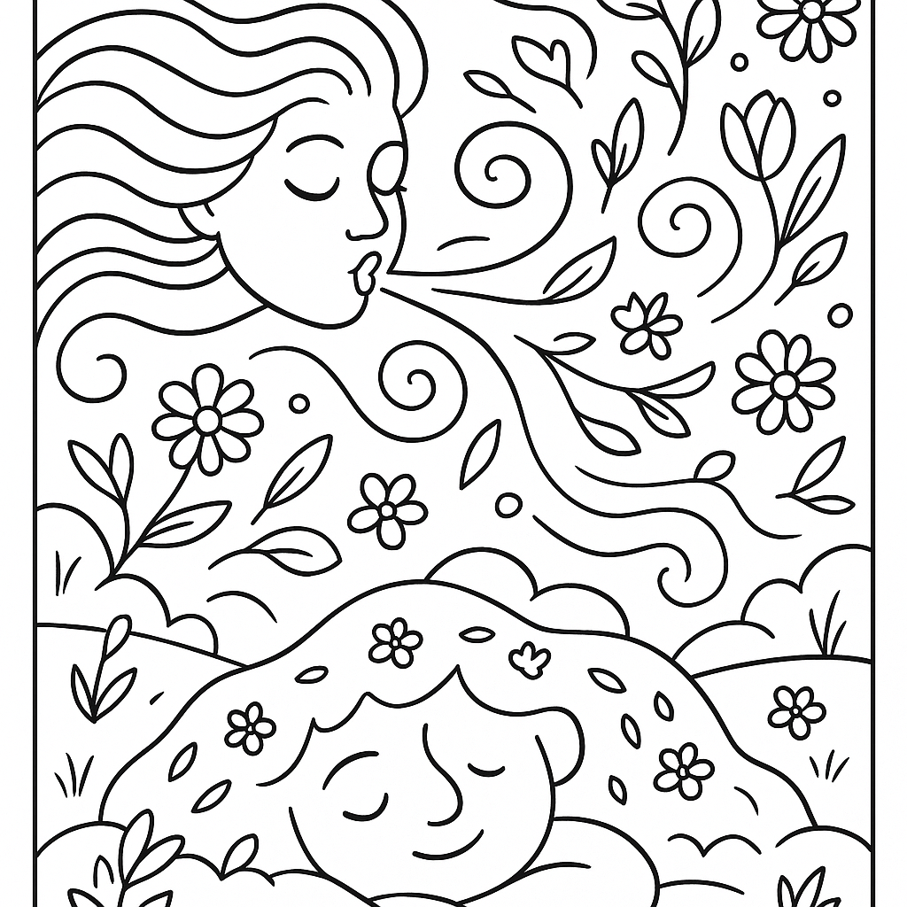 A medium coloring page featuring wind spirit bringing spring breezes to wake sleeping earth. Perfect for kids (6-9) with moderately detailed outlines for a fun coloring experience.