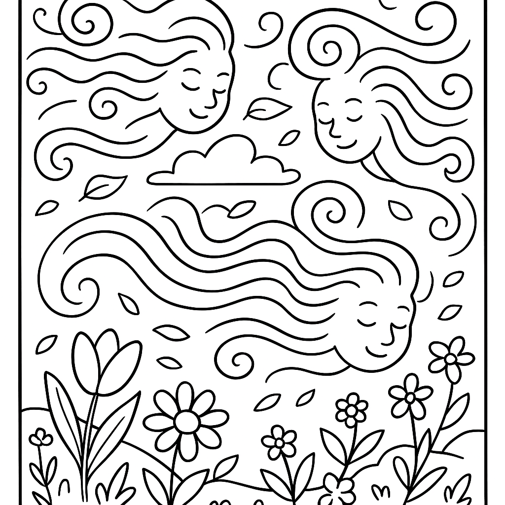A medium coloring page featuring wind spirits bringing spring breezes. Perfect for kids (6-9) with moderately detailed outlines for a fun coloring experience.