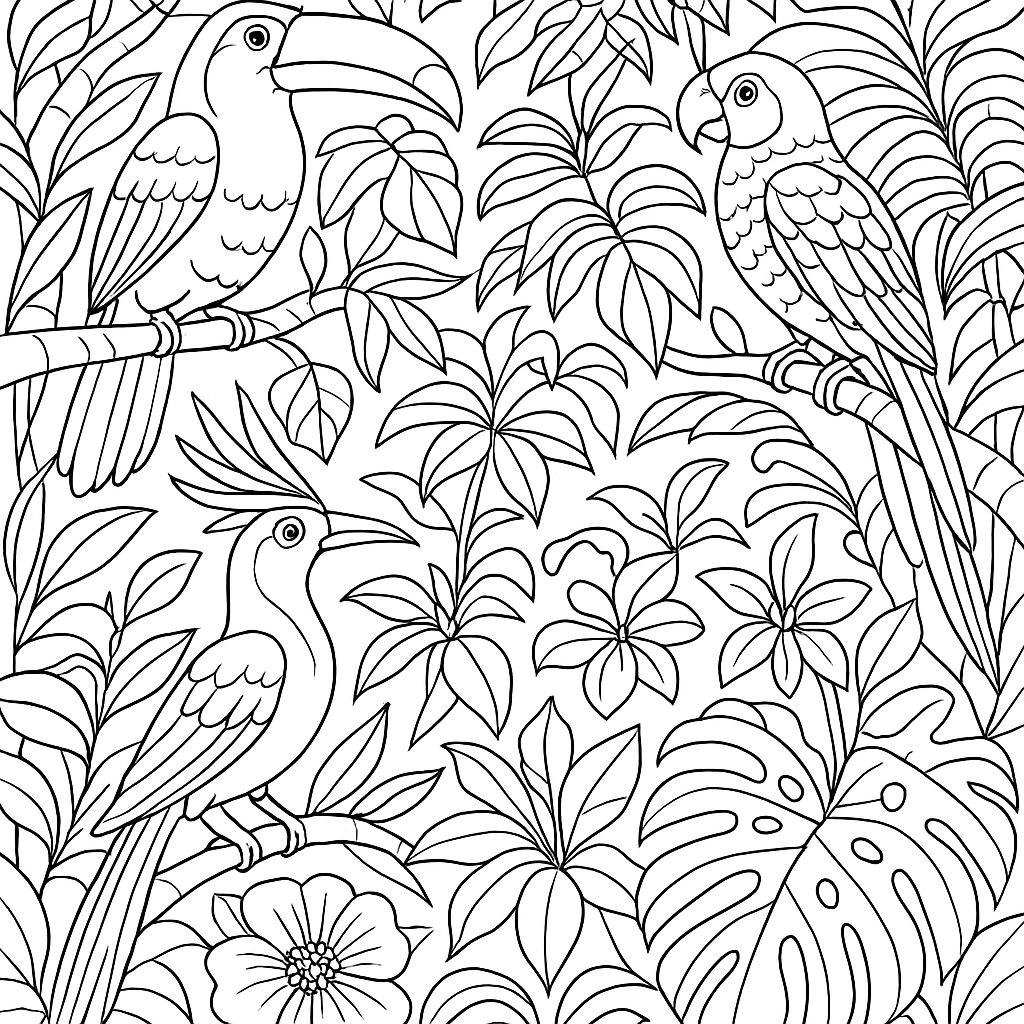 A detailed coloring page featuring rainforest canopy with rare birds and exotic plants. Perfect for tweens (9-12) with intricate detail for a fun coloring experience.