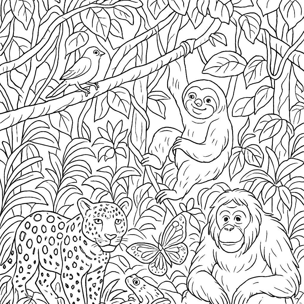 A detailed coloring page featuring rainforest with canopy and endangered animals. Perfect for tweens (9-12) with intricate detail for a fun coloring experience.