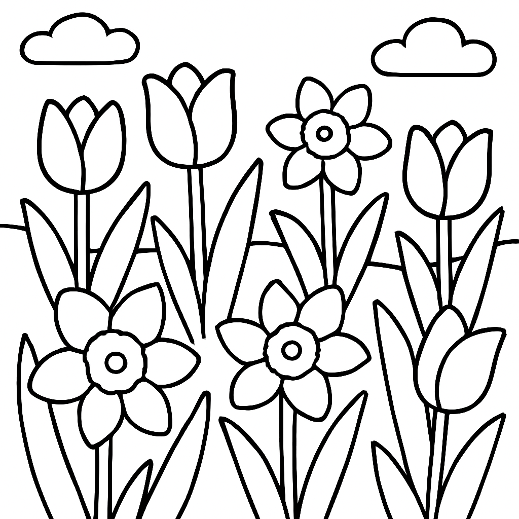 A simple coloring page featuring a field of blooming tulips and daffodils. Perfect for toddlers (2-4) with large, bold outlines for a fun coloring experience.