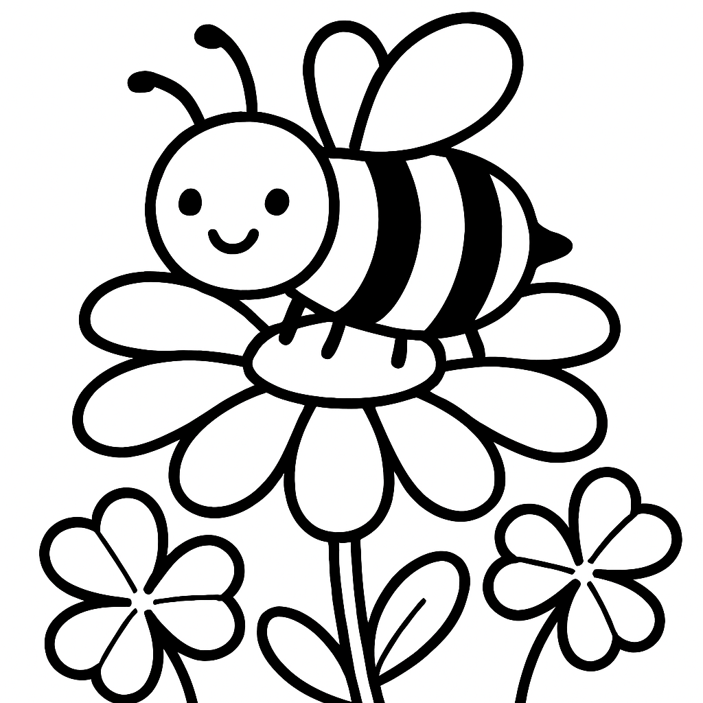 A simple coloring page featuring a friendly bumblebee resting on a large daisy with petals fanning out, surrounded by clover leaves. Perfect for toddlers (2-4) with large, bold outlines for a fun coloring experience.