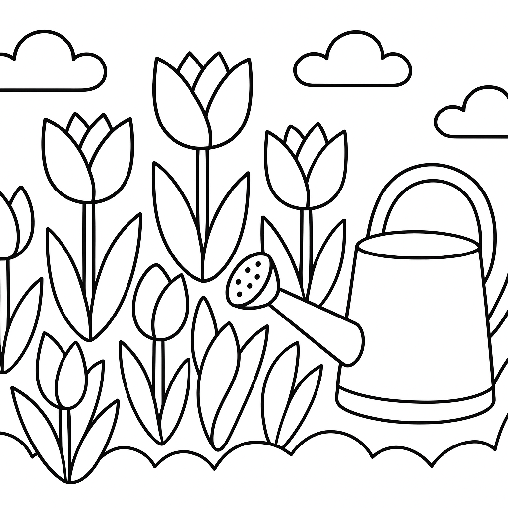 A simple coloring page featuring a tulip garden with blooming bulbs and a watering can. Perfect for kids (4-6) with large, bold outlines for a fun coloring experience.