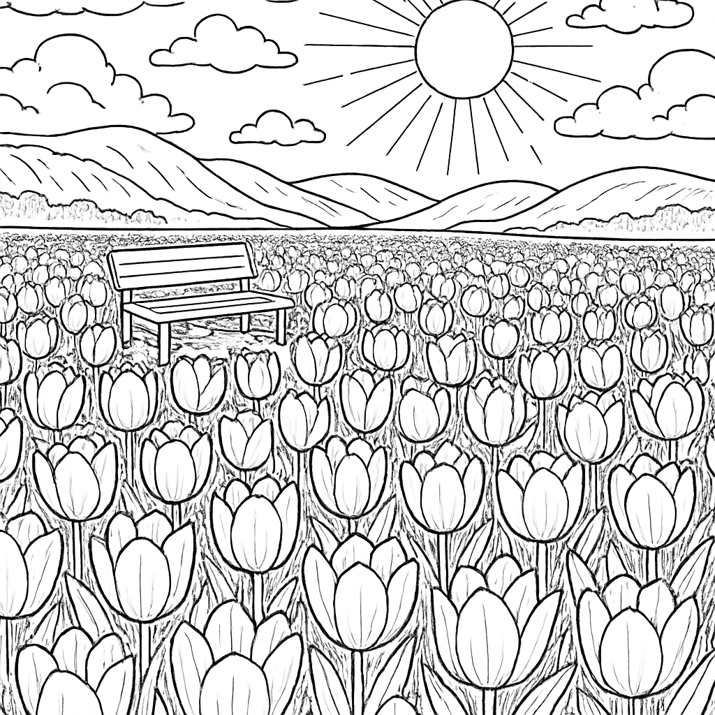A detailed coloring page featuring a wide tulip field in full bloom with a small wooden bench, rolling hills in the background, and a bright sun above. Perfect for kids (6-9) with intricate detail for a fun coloring experience.
