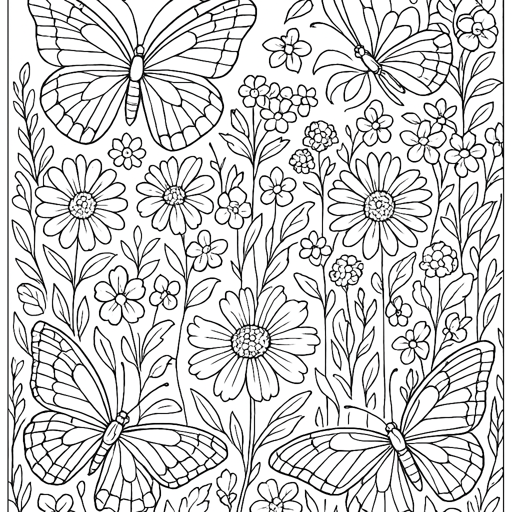 A detailed coloring page featuring butterfly garden with various flowers and butterflies. Perfect for tweens (9-12) with intricate detail for a fun coloring experience.