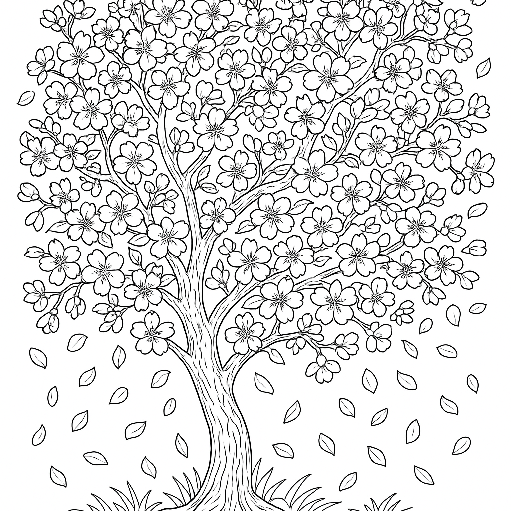 A detailed coloring page featuring cherry blossom tree in full bloom with petals falling. Perfect for tweens (9-12) with intricate detail for a fun coloring experience.